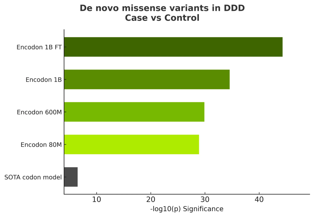 《国际医药商情》观察到,论文展示了不同规模模型在多个任务上的性能对比。在发育障碍和自闭症谱系障碍队列的从头错义突变数据中,EnCodon 模型显示出比其他无监督蛋白质和 RNA 序列模型更强的病例对照变异分离能力。零样本设置下,模型使用参考和突变密码子之间的对数似然差异进行评分,无需任何任务特定训练。