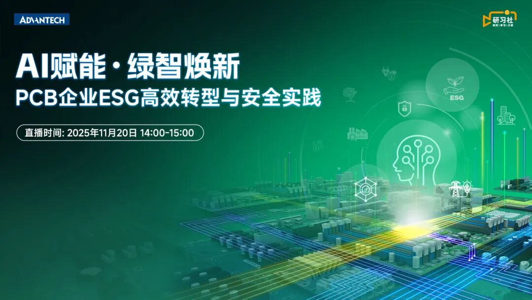 11月20日下午14:00,研华科技研习社将重磅推出【AI赋能·绿智焕新】PCB专题直播。研华智能制造专家团队将亲临直播间,深入剖析PCB行业ESG高效转型的破局之道,并聚焦以下三大实施路径,结合头部企业落地实践,为您呈现可借鉴、可复制的转型方法论: