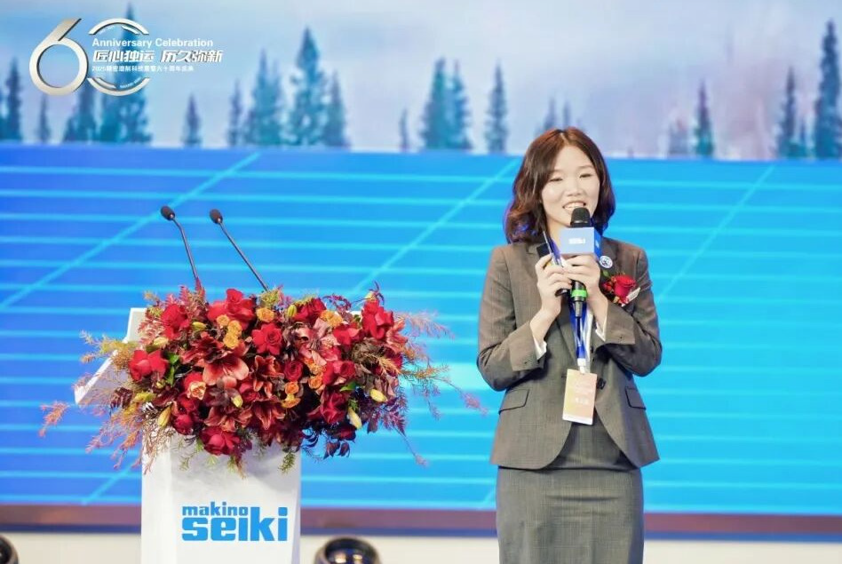 牧野精机(苏州)有限公司总经理施海燕在致辞中回顾了牧野精机的发展历程,并表达了对客户与合作伙伴的感恩。她提到,牧野精机在日本创立60周年,在中国深耕17年,从最初的技术引进到如今的本地化服务与创新,始终坚持“匠心独运,历久弥新”。