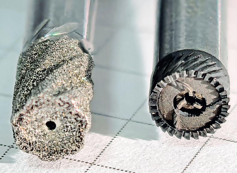 左侧为金属结合金刚石颗粒的研磨刀具,右侧为带有多个定义切削刃的PKD铣削刀具