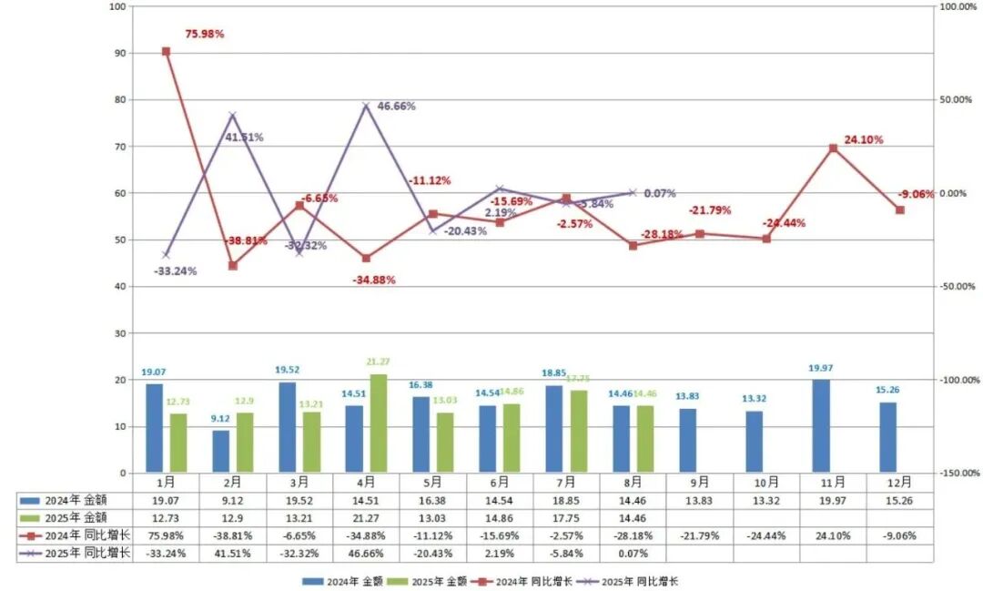 2025年前三季度,德国机械出口总额达1479亿欧元,较去年同期下降3.1%。经价格变动调整后,实际降幅为4.6%。第三季度出口下滑4.1%,其中9月份同比下跌3.4%。当前焦点集中于对美贸易:1月至9月期间,对美机械设备出口下降9.4%,第三季度尤为严峻,跌幅达14.2%。8月对美出口骤降18.5%,9月仍维持10.8%的负增长。