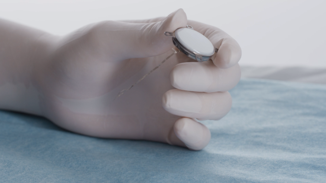 图为植入体与电极——植入体直径26mm、厚度不到6mm,仅硬币大小;超柔性电极,尺寸极小,直径仅约头发丝的1/100,受访者供图