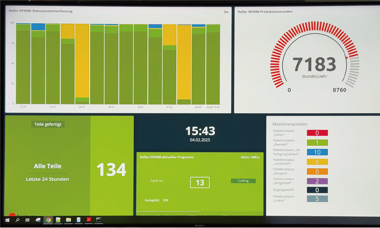 Fastems的仪表板可一目了然地显示生产率和利用率,根据图上显示,Cutmetall在自动化模式下生产了7183个小时