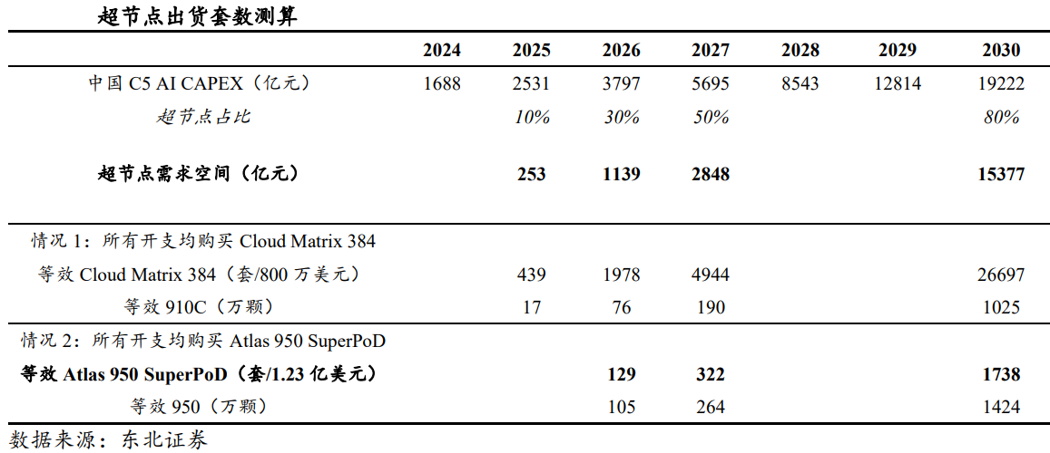 东北证券预计中国互联网C5(阿里巴巴、字节跳动、腾讯、美团及百度)AI基础设施资本开支将从1688亿元增长至1.92万亿元。超节点作为高密度算力部署的核心基础设施,其在C5资本开支中的占比将随时间快速提升,假设该占比从2025年的10%上升至2030年的约80%,对应的超节点需求空间将从2025年的253亿元增至2030年的1.54万亿元。