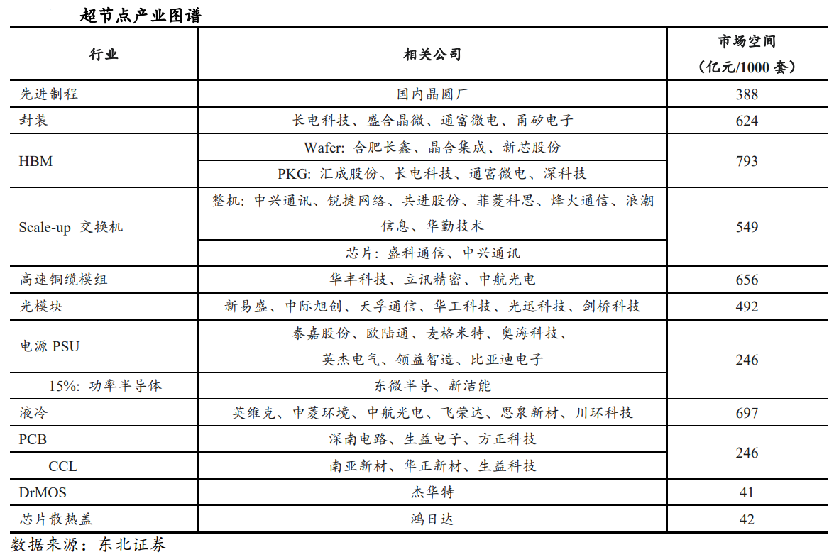同时,东北证券以国内某通信巨头Atlas950作为测算标准,假设年出货1000套,给出了先进制程晶圆代工、封装、HBM,Scale-up交换芯片,高速铜缆模组,光模块,电源,液冷,PCB,DrMOS,散热盖等各环节的市场空间。荣格电子芯片统计,据此测算,这将带来总计4774亿元的半导体产业链价值规模。