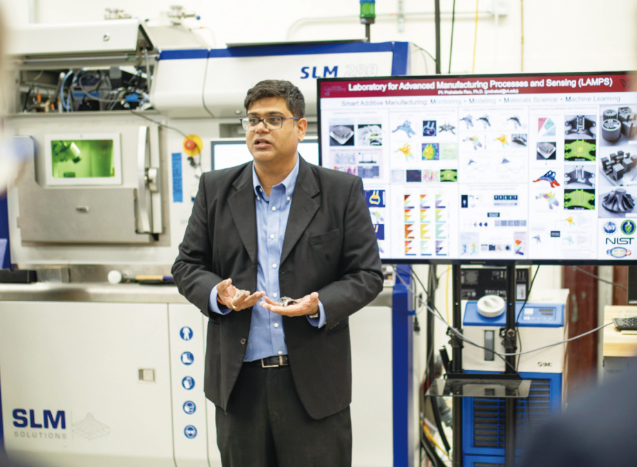 弗吉尼亚理工大学工业与系统工程系副教授Prahalada Rao在凯利大厅未来制造实验室发言