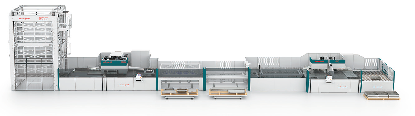 ● 上游配备了MD单立库,可为 S4.G4 冲剪复合中心供料;以及中游的MC自动机械手,用于卸料和码垛工件,同时为 P4.G4 多边折弯中心供料,并作为缓冲设备平衡系统;