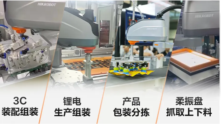 依托完善的产品矩阵与核心技术优势,海康机器人SCARA产品系列在3C装配/组装、锂电生产组装、产品包装分拣、柔振盘抓取上下料等多行业场景中持续发力,实现广泛落地。