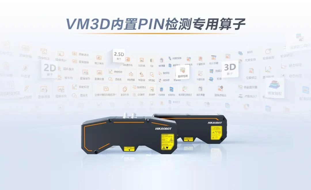 海康机器人PIN针3D质检方案,采用3D双目单线激光轮廓传感器,替代传统的“对头架设“方案,搭配自研VM3D算法平台,内置PIN检测专用算子,能够进行在线非接触式实时检测。