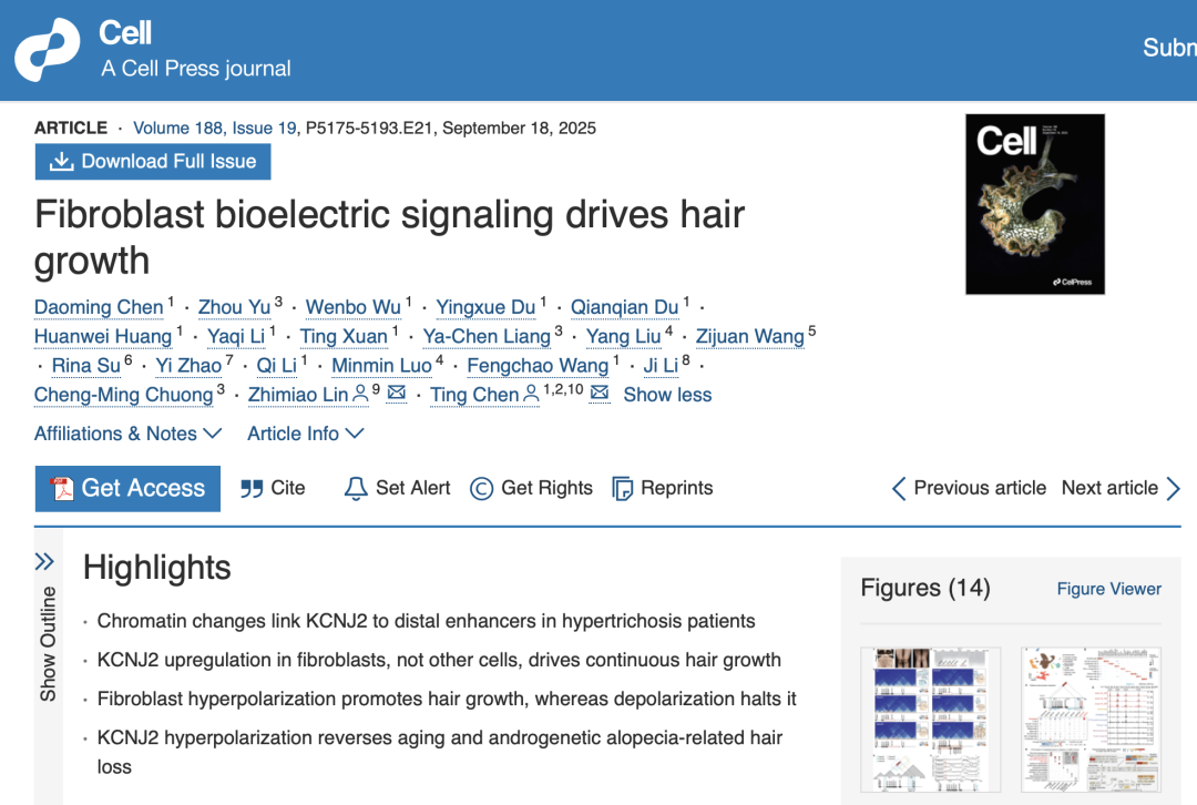 2025 年 8 月 15 日,北京生命科学研究所/清华大学陈婷团队与南方医科大学林志淼团队合作,在《Cell》发表研究,题为 “Fibroblast bioelectric signaling drives hair growth”。论文揭示了一个此前未被认识的现象——皮肤成纤维细胞的膜电位变化会影响毛囊周期,从而调控毛发再生。