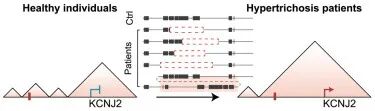 该研究对 5 例携带不同染色体 17 号结构变异的 CGHT 患者进行 Hi-C 三维基因组分析,发现不同类型的结构变异均导致 KCNJ2 所在区域与新的增强子产生异常接触,从而使 KCNJ2 在皮肤成纤维细胞中过度表达。