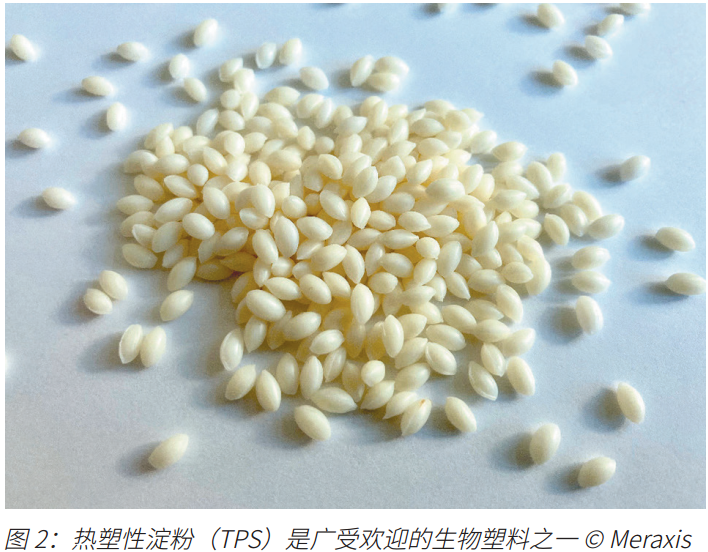目前需求旺盛的生物基聚合物包括生物基PET(bio-PET)、聚乳酸(PLA)和热塑性淀粉(TPS)(图2)。生物基PET在化学结构上与化石基PET相似,因此可在现有设备上直接加工而无需调整工艺。而PLA和TPS通常需要特定的添加剂改性,例如改善其热稳定性或防潮性能。它们的流变性能也与化石基聚合物存在差异,因此需要仔细调整加工参数,尤其是在注塑成型和挤出加工过程中。