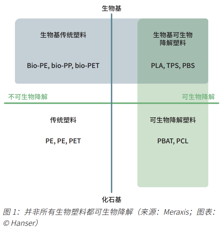 生物聚合物这一术语同时涵盖了生物基聚合物和可生物降解聚合物(图1)。在工业领域,对这两类聚合物进行区分至关重要。生物基聚合物完全或部分来源于可再生原料,但其本身并非一定可生物降解。例如,生物聚乙烯(bio-PE)和生物聚丙烯(bio-PP)虽是生物基材料,但其化学结构与化石基同类产品完全一致,因此不可生物降解。相反,某些化石基聚合物却能够完全生物降解。例如,聚己二酸-对苯二甲酸丁二酯(PBAT)和聚己内酯(PCL)源于化石原料却具有生物可降解性。