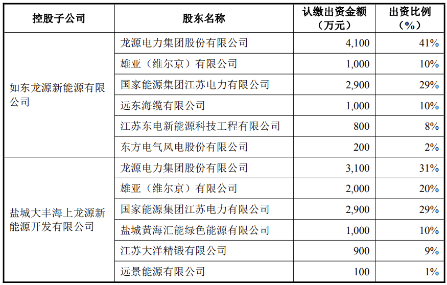 公告指出,龙源电力及其全资子公司雄亚(维尔京)有限公司拟与国家能源集团江苏电力有限公司及其他交易对方分别签订投资协议,共同出资设立如东龙源新能源有限公司、盐城大丰海上龙源新能源开发有限公司以及射阳龙源新能源有限公司。