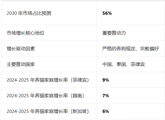这与该地区严格的养狗规定和宗教偏好有关。中国、泰国和菲律宾等国是这一增长背后的主要推手,推动了对猫咪相关及健康宠物产品的需求。
