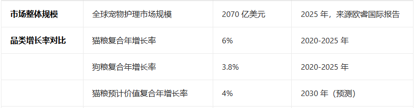 全球宠业出海洞察获悉,根据欧睿国际(Euromonitor International)《2025年全球宠物护理市场报告》,2025年全球宠物护理市场规模将达到2070亿美元,而猫粮已成为增长最快的类别。