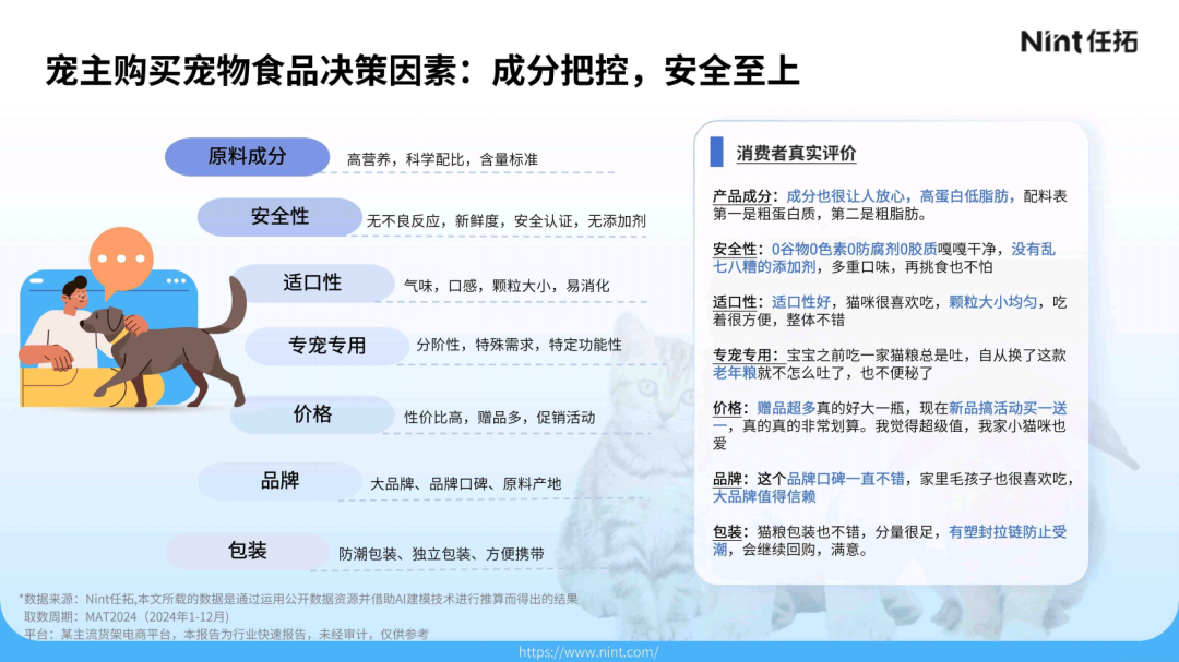 消费者对宠物食品的要求已远不止于饱腹。任拓倾听消费者评价数据显示,影响宠主购买决策四大核心要素主要包括:成分、安全性、适口性及专宠专用。