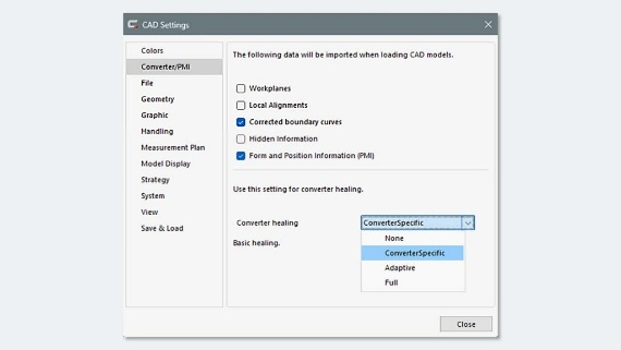 全新的修复转换器对话框,让您能够自定义导入CAD文件时应用的优化程度。转换器可以填补数据空白、修复现有的PMI信息,并提供从基础校正到完整模型恢复的多种修复模式。