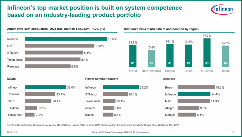 英飞凌财报显示,在汽车半导体领域,其拥有无可争议的领先地位。其全球市场占有率达13.5%,超过恩智浦、意法半导体、德州仪器以及瑞萨电子等一众巨头。