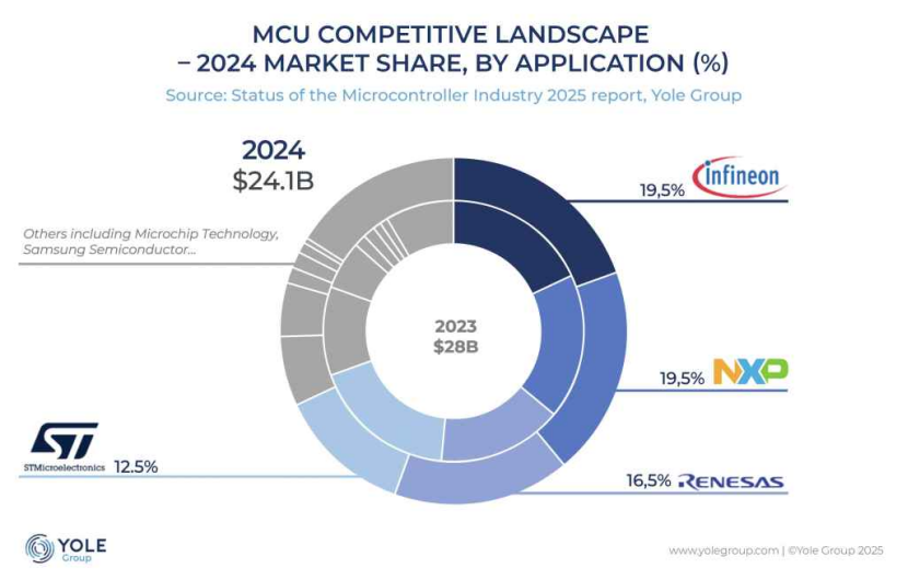 2024年MCU的市场格局中,英飞凌市场份额达到19.5%,恩智浦的市场份额达到16.5%,瑞萨半导体的市场份额达到16.5%,意法半导体的市场份额达到12.5%。