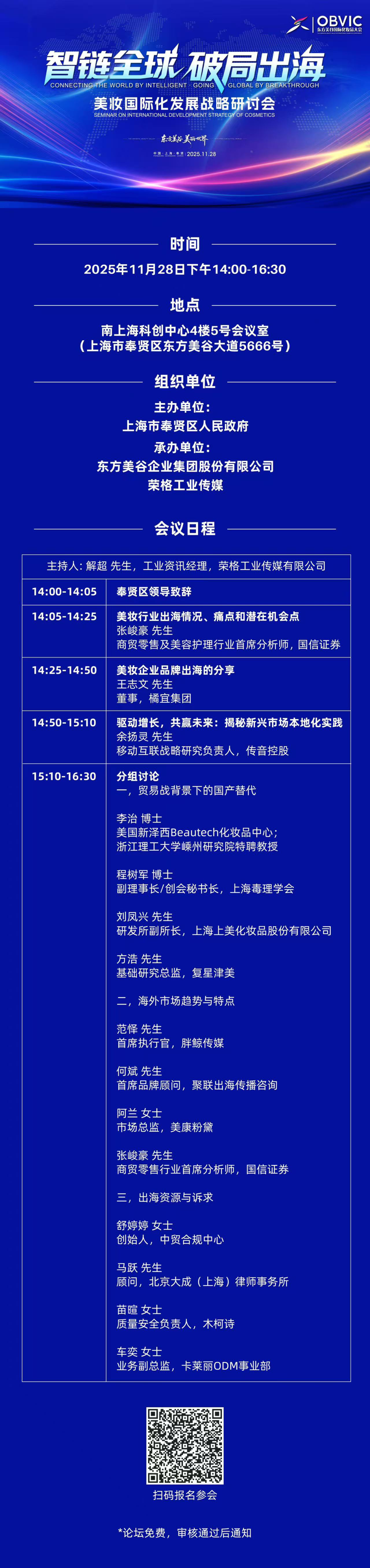11月28日由上海市奉贤区人民政府主办,东方美谷企业集团股份有限公司和荣格工业传媒承办的智链全球,破局出海-美妆国际化发展战略研讨会将在奉贤区东方美谷大道5666号南上海科创中心4楼5号会议室如期召开,共同探索国妆出海新路径。