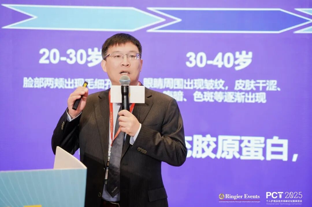 上午场由环特生物化妆品事业部总经理周示玉先生主持。上海相宜本草化妆品股份有限公司基础研究负责人陈其龙先生以《皮肤细胞衰老的能量调控新策略》切入,从细胞能量维稳的角度呈现抗老路径的前移趋势。山东济肽生物科技有限公司产品总监司呈元先生带来《全球视野下的多肽研发与应用》,展示肽类在结构改善中的战略性地位。法国茜莱博中国代表处办公室总经理孙鹏先生以《脂质平衡重塑屏障,让干燥肌肤不破防!》强调了脂质管理在抗衰系统中的基础作用。懿奈(上海)生物科技有限公司研发负责人胡璠博士在《针对面部不同区域皮肤衰老特征的护理方案》中提出更精细化的人群分层。上海珈凯生物股份有限公司技术创新中心总经理卢伊娜女士带来《溯本求源:糖化衰老的深度解构》。深圳市护家科技有限公司/HBN 生物技术研究专家钟江鸣博士在《解码皮肤衰老新机制:从关键驱动因素到靶向干预展望》中扩展了抗衰路径的可能性。