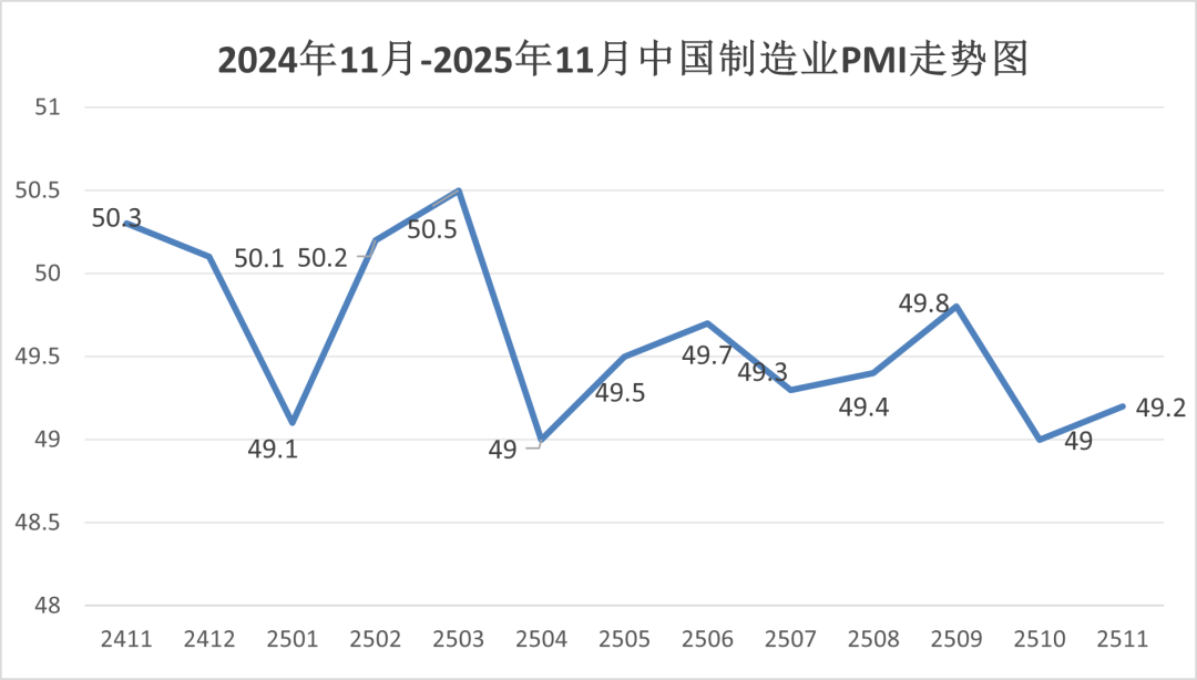 国家统计局服务业调查中心、中国物流与采购联合会发布的2025年11月份中国制造业采购经理指数(PMI)为49.2%,比10月上升0.2个百分点。