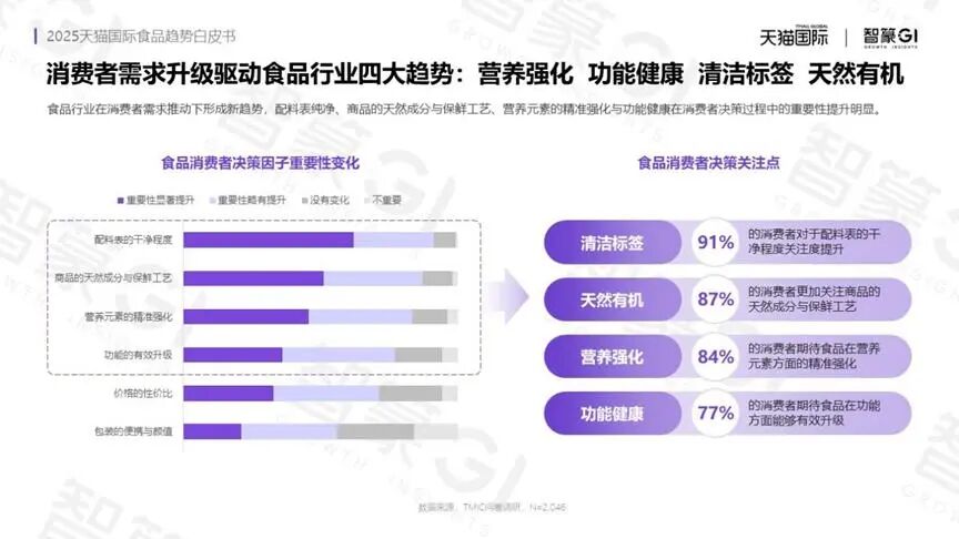 《2025天猫国际食品趋势白皮书》为我们清晰地勾勒出一幅未来食品消费的立体图景:既高度理性,追求成分的精准与透明;也充满感性,探索风味的多元与乐趣。在营养强化、功能升级、清洁标签、天然有机这四大趋势的引领下,中国进口食品市场正迈向一个更加成熟、更富层次的发展新阶段。