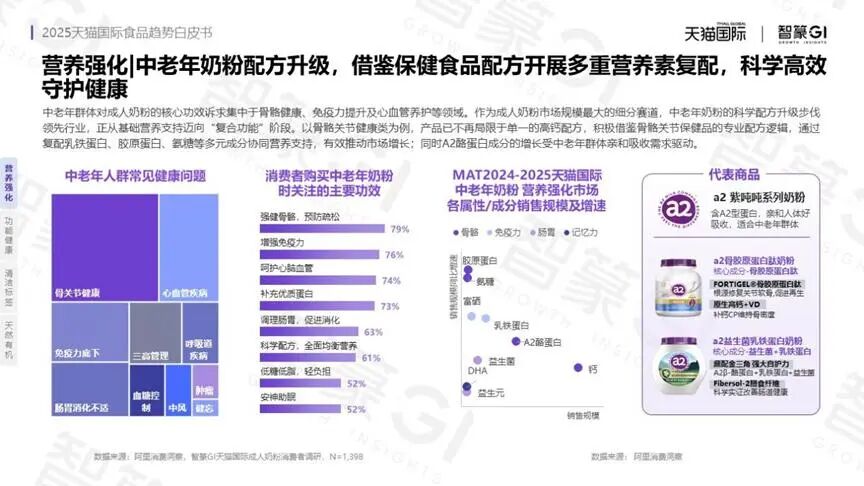 营养补充需求正变得前所未有的精细。86%的消费者注重通过饮食进行营养补充,并聚焦于家庭中需求最高的成员。中老年群体仍是核心主力,其奶粉产品从基础的高钙配方,升级为复配乳清蛋白、胶原蛋白、氨糖等多重营养素的“复合功能”配方,精准应对骨骼、免疫、心血管等健康问题。