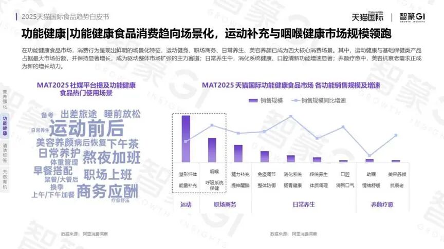 市场呈现出深度的场景化特征:运动健身场景下,富含马基莓等抗氧化超级食物和精准电解质的功能饮料与冲饮粉剂快速增长;职场场景中,针对咽喉健康的润喉糖表现稳健,薄荷、蜂胶等经典成分备受青睐;日常养生与养颜疗愈场景下,助眠、肠胃健康、口服美容等产品也成为新的增长动力。高消费人群是功能健康食品的拥趸,其占比近6成,且客单价增速高于整体食品,显示出强大的市场潜力。
