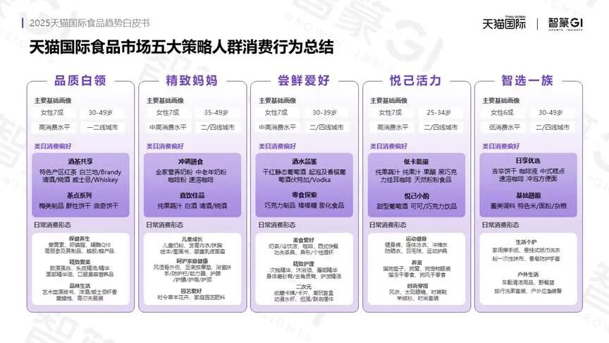 基于这些差异,白皮书将消费者归类为五大策略人群:追求生活质感的品质白领、注重全家健康的精致妈妈、乐于探索新奇风味的尝鲜爱好者、青睐高效健康方案的悦己活力族以及专注性价比的智选一族。五类人群并存,共同构成了百花齐放的繁荣生态。