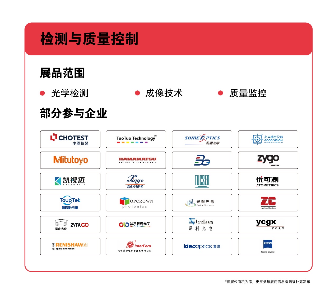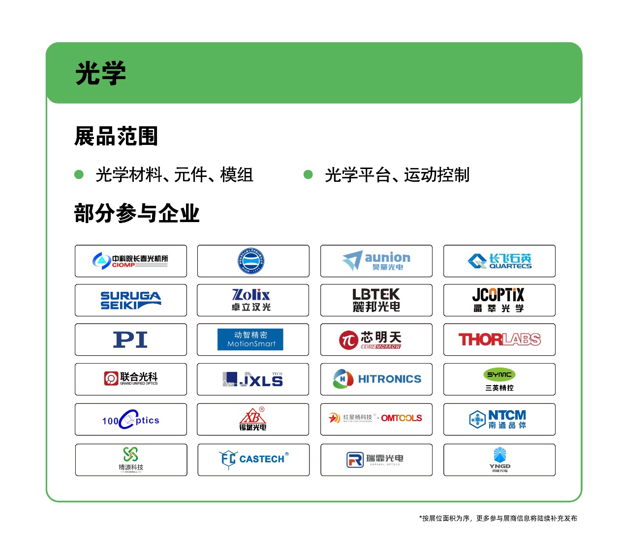 本次展会的展商阵容从激光加工设备领域的全球领军品牌,到光学元件与材料细分市场的隐形冠军,再到光电检测技术的创新先锋,国内外超 1200 家企业已报名参展,并分批进行展位确认中。他们将带来覆盖工业制造、通信技术、生物医疗、科研国防、传感器技术、精密机械、汽车工程等全产业链的前沿产品与解决方案,无论是突破精度极限的超快激光设备,还是引领技术革新的 AR/VR 光学模组,亦或是赋能智能生产的光电传感系统,更有实现多维度功能融合的集成光电模块、打破性能瓶颈的高端光电芯片、适配先进制程的半导体光刻设备、驱动交互升级的具身智能光学终端、助力精准诊疗的生物医学光子仪器,以及探索微观世界的前沿光子学产品,都将在展会现场集中亮相,上演一场硬核科技的视觉盛宴。