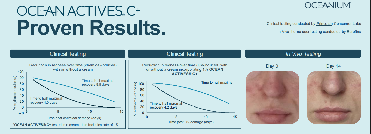 在供应链、提纯技术和功效验证方面,新兴企业的推动更加明显。以英国苏格兰公司 Oceanium 为例,其富含褐藻糖胶(fucoidan)的原料体系。例如 OCEAN ACTIVES C+ 不仅在官网公布成分规格,还公布独立或联合实验室完成的人体皮肤数据,如依据官方公开测试数据,仅 1% 添加量时可见红肿指标显著下降,屏障指标上升。