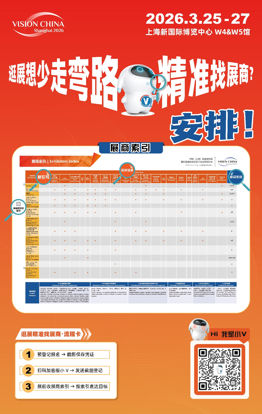 小V准备了超实用的展商索引——清晰标注各展商应用领域与展品类别。让您省去筛选麻烦,直奔目标展台。现在完成预登记报名并添加客服小V,展前免费发放这份实用指引,提前规划行程、锁定核心资源。早登记早省心,赶紧行动,解锁这场机器视觉行业盛宴!