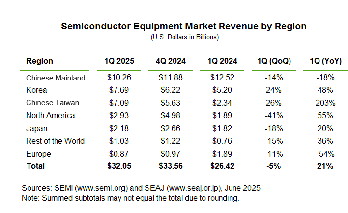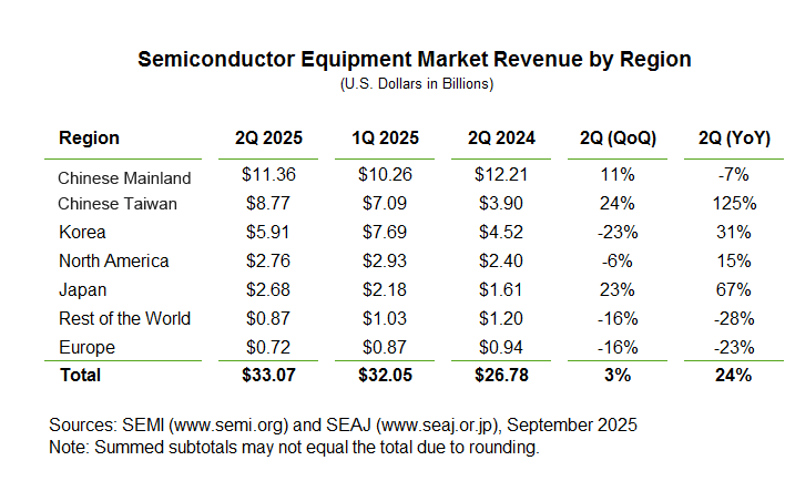 SEMI数据显示,2025年第二季度全球半导体设备出货金额达到330.7亿美元,同比增长24%。受先进逻辑制程、HBM相关DRAM应用以及亚洲地区出货量增加的推动,2025年第二季度销售额环比增长3%。