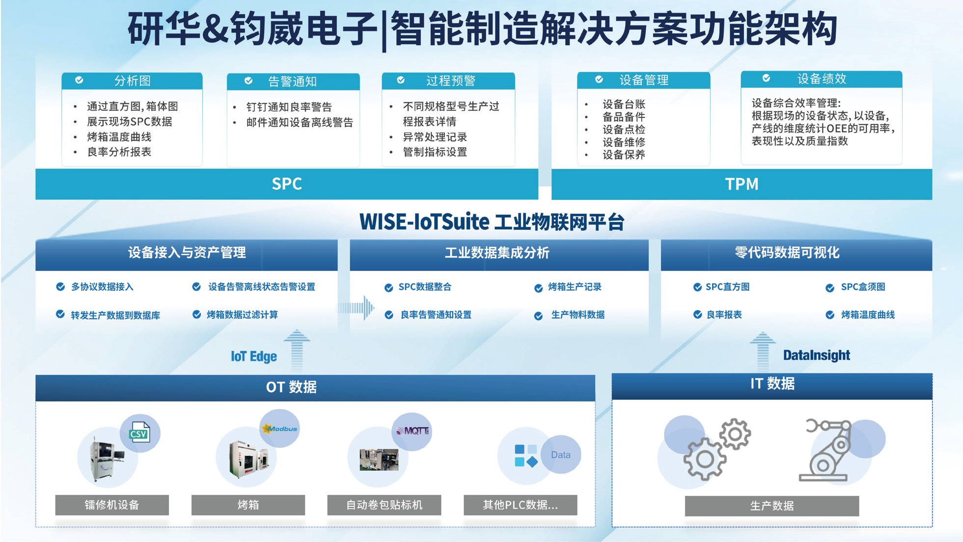 在深入了解钧崴电子生产运营现状、痛点与需求之后,研华为其量身打造了涵盖IoTSuite工业物联网平台+SPC统计过程控制+TPM全面生产维护解决方案的iFactory智能制造解决方案。