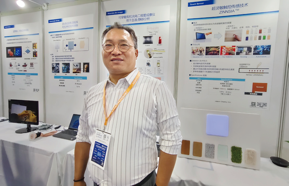 晶端显示的技术支持经理管益川介绍,在2025 SENSOR CHINA展会上,晶端显示重点展示了多款创新型传感器产品。如,高灵敏度新型触控传感器Zinnsia——可以将木材、大理石、织物、皮革,甚至植物都变成触控媒介;触觉压力传感器——可以实现高精度、大范围的压力感测,实现压力分布的高精度可视化;可拉伸传感器——可以像皮肤一样能够伸缩弯曲和扭曲,非常适合可穿戴和医疗设备;OPD传感器——带有机光电二极管的传感器,可在柔性基板上形成有机光电探测层,轻薄柔性,适合下一代生物识别技术。