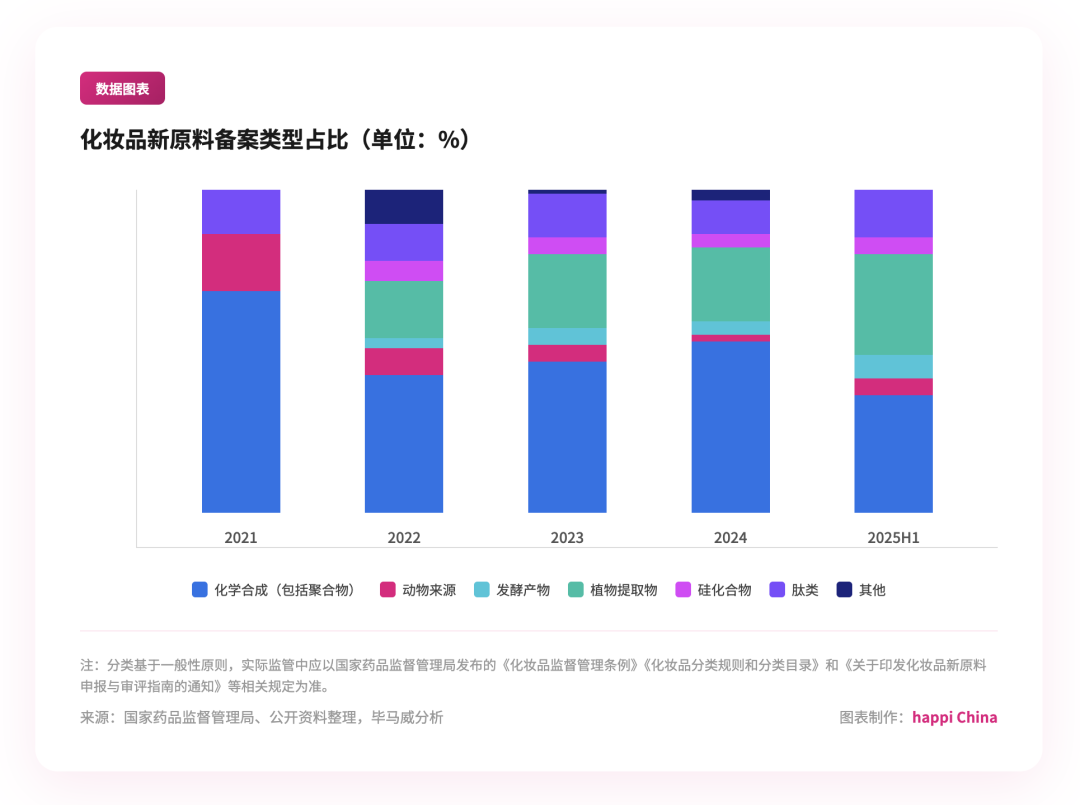 从原料类型来看,化学合成原料(含聚合物)占据主导地位,累计备案达 122 个。聚合物类原料因在成膜、乳化、质感改良等方面的独特优势,满足了市场对产品创新的需求。植物提取物备案量显著提升,从早期仅有 1 个增至 24 个,反映了市场对「天然来源」「绿色成分」的热捧。备受关注的多肽类原料备案数量从 2021 年的 1 个增加至 2025 年上半年的 14 个;发酵产物的备案数量则从 0 个增加至 6 个。