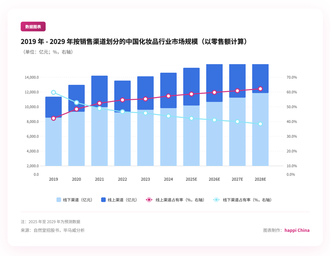 报告援引自然堂招股书数据显示,线上渠道的市场占有率从 2019 年的 40.8% 提升至 2024 年的 57.4%,预计 2029 年将进一步攀升至 63%。2021 年成为关键拐点——线上零售额首次超越线下,标志着消费者行为的根本性转变。