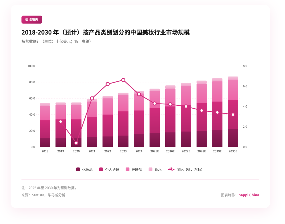 Statista 数据显示,2024 年中国美妆行业市场规模(按营收额计)达到 694.1 亿美元,预计 2025 年将增至 724.1 亿美元,2030 年有望触及 867.2 亿美元。尽管年均复合增长率已从早年的两位数回落至 3.8%,但绝对规模仍稳居全球第一。