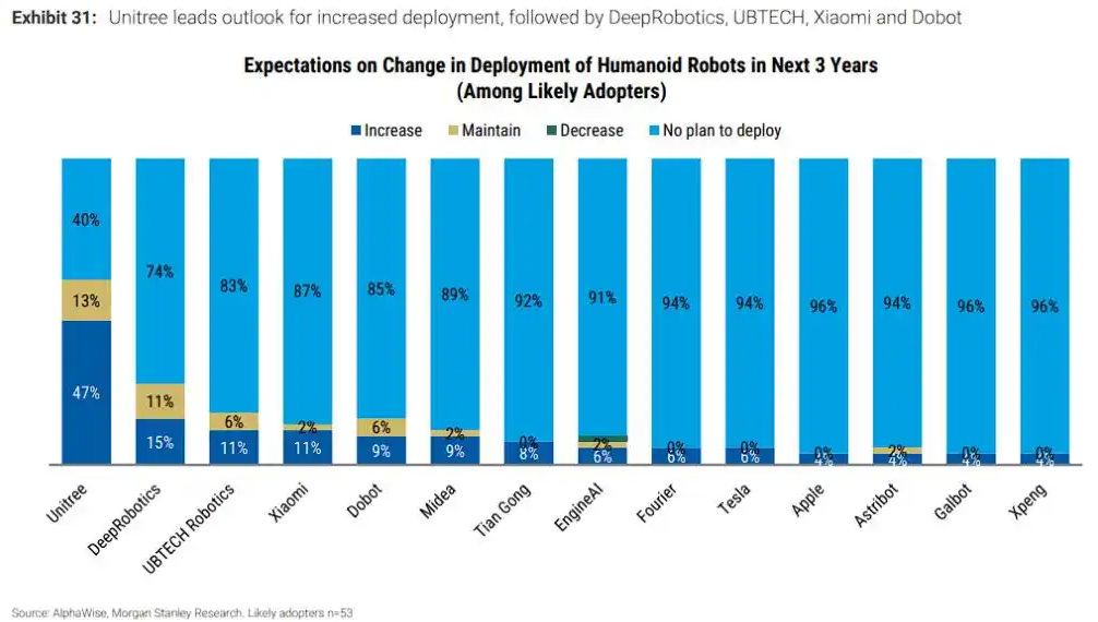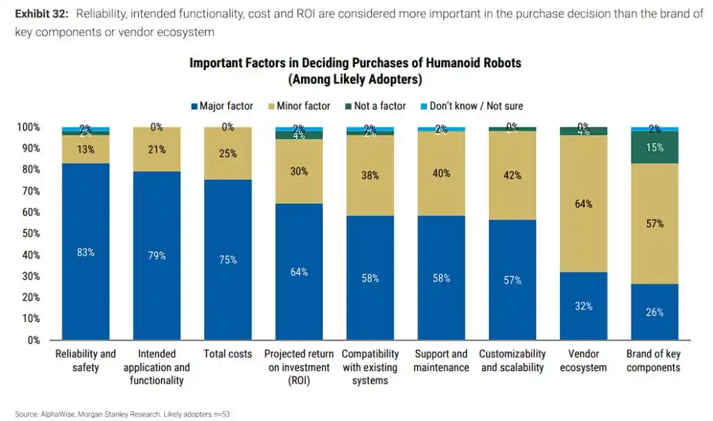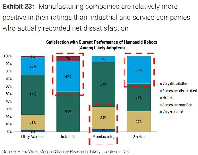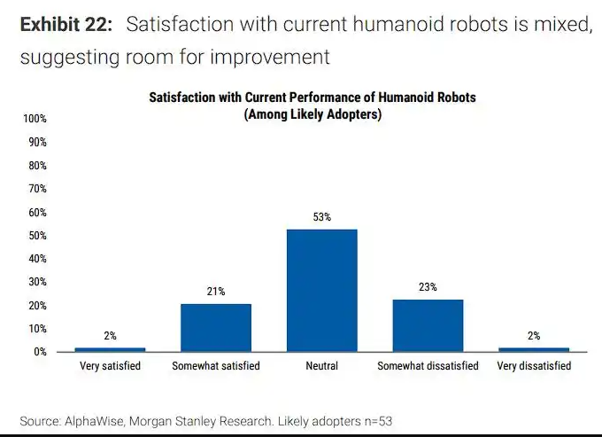 大摩调研显示,仅有23%的受访者对当前人形机器人产品表示满意,53%持中性态度,25%表示不满意。