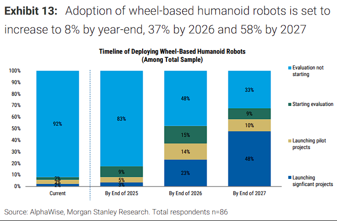 相比之下,轮式人形机器人的部署比例为2025年8%、2026年37%、2027年58%;