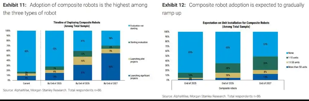 复合机器人的采用速度最快:21%的企业计划在2025年部署,2026年扩大至48%,2027年达到64%。