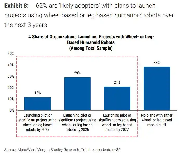 在86家受访企业中,53家(62%)被定义为"可能采用者",计划在未来三年内启动人形机器人试点或重大项目。具体而言,12%计划在2025年投资,29%在2026年,21%在2027年。