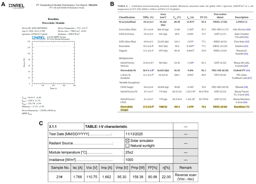 基于上述方法,研究团队制备了0.72平方米的商用钙钛矿光伏组件。经美国可再生能源实验室认证,其稳态光电转换效率达17.2%,创下了当时的世界纪录。