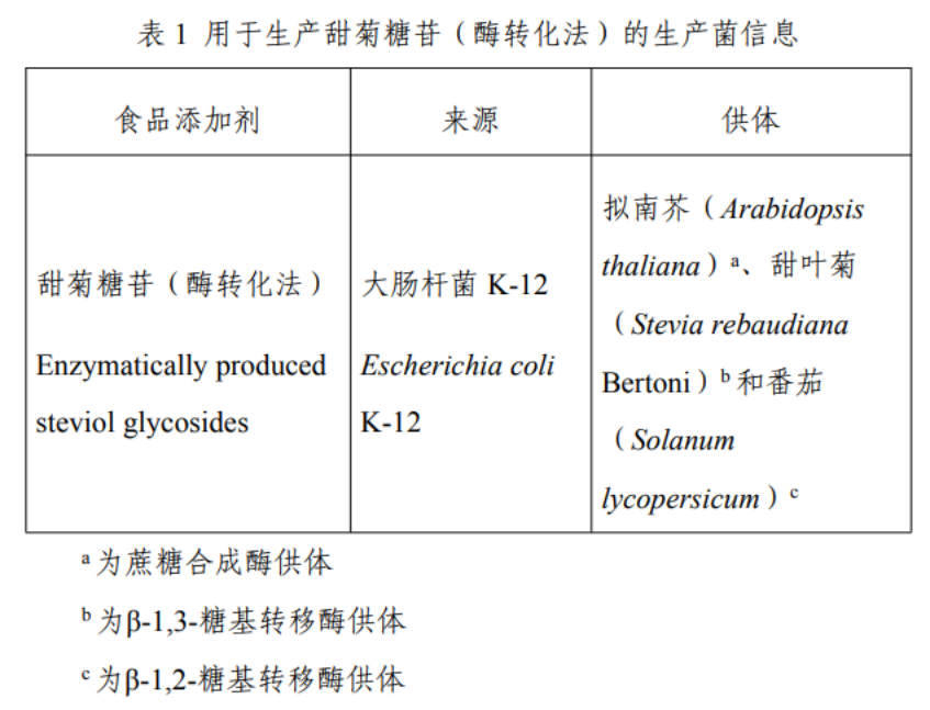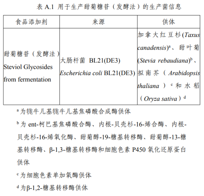 该物质的质量规格要求按照国家卫生健康委员会2024年第 2 号公告执行[附录 A 用于生产甜菊糖苷(酶转化法)的生产菌信息除外],该食品添加剂新品种的生产菌信息见下表。