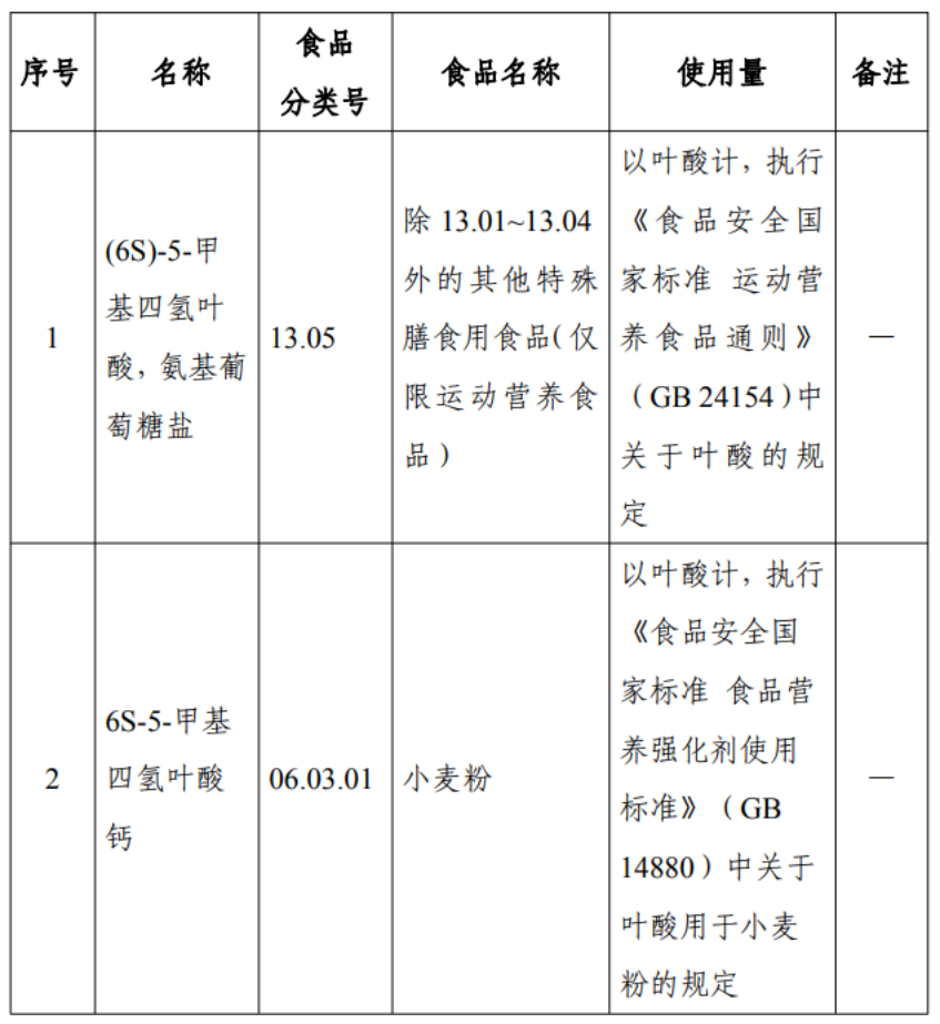 原国家卫生和计划生育委员会2017年第13号公告及相关公告批准食品营养强化剂新品种6S-5-甲基四氢叶酸钙作为叶酸的化合物来源用于调制乳粉、固体饮料、特殊医学用途配方食品(13.01中涉及品种除外)等食品类别。本次公告扩大使用范围用于小麦粉(食品类别06.03.01),增加食品中叶酸含量。