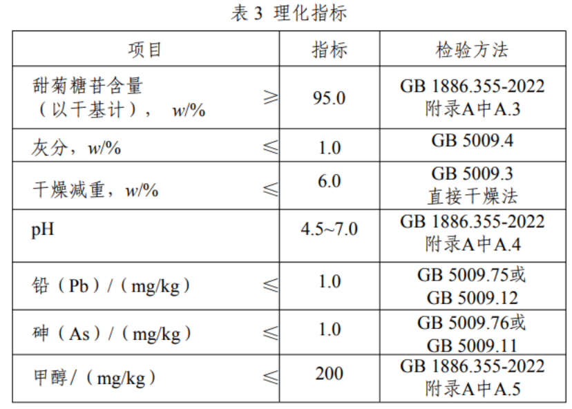 本质量规格要求适用于以葡萄糖为原料,经发酵后通过灭活、树脂处理、浓缩、结晶、干燥制得的食品添加剂甜菊糖苷(发酵法)。甜菊糖苷(发酵法)的生产菌应经过安全性评估并符合附录A的要求。
