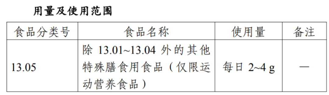 本次发布公告的β-丙氨酸作为食品营养强化剂新品种,用于除13.01~13.04外的其他特殊膳食用食品(仅限运动营养食品)(食品类别13.05)。