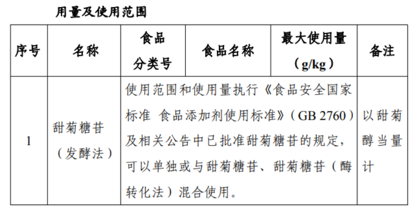 本次公告的甜菊糖苷(发酵法)是利用新生产工艺制得的食品添加剂新品种,其使用范围和使用量执行GB 2760及相关公告中已批准甜菊糖苷的规定。该物质作为甜味剂,改善产品口感、替代蔗糖。